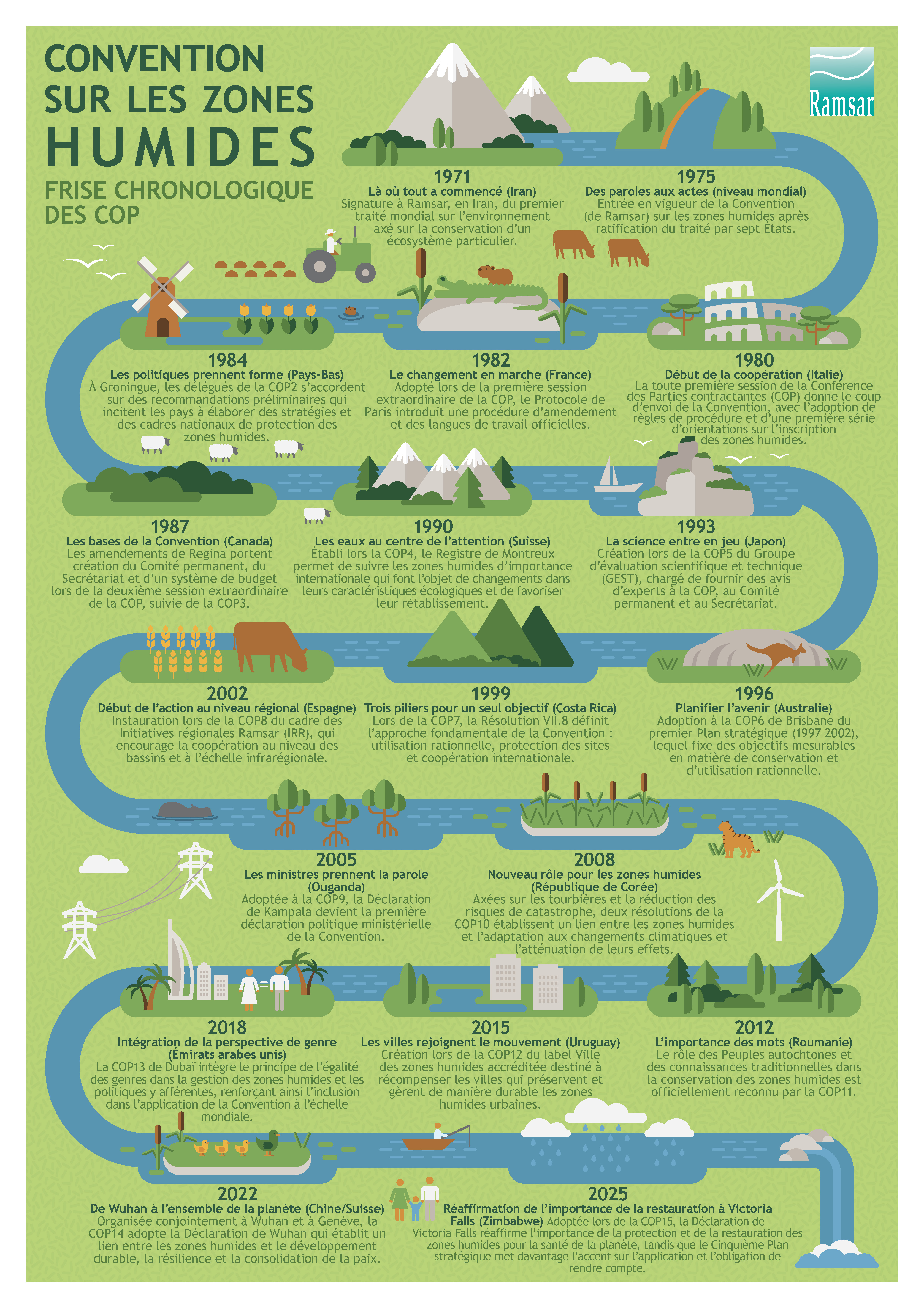 Cette année, nous avons également préparé une chronologie complète de toutes les sessions de la Conférence des Parties contractantes, pour appréhender l’évolution de la Convention. Cette chronologie reflète plus de cinq décennies de collaboration, d’apprentissage et d’ambition partagée et j’ai le plaisir de la partager avec vous afin que nous nous souvenions de la distance parcourue et de ce qu’il nous reste encore à faire ensemble.